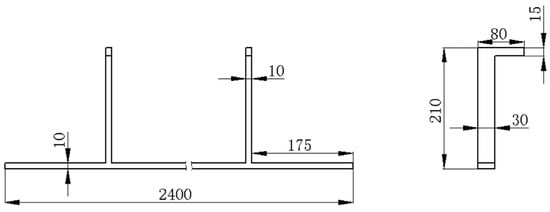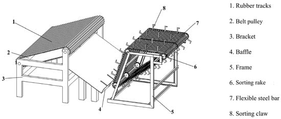 In order to convey the sugarcane grasped by the manipulator in a relatively uniform and orderly state, the sorting and conveying device is designed as a three-stage operation stroke, which includes the lifting conveyor belt, the cane collecting board, and the sorting mechanism, and its structure is shown in Figure 3. The lifting conveyor belt is made of serrated rubber tracks, which can separate the canes and prevent them from rolling back down. According to engineering experience and the actual conveying situation in the early stage, the lifting and conveying angle is set to 30°. The sugarcane is lifted by the lifting conveyor belt at a steady pace while in operation, allowing it to be transported in a comparatively uniform condition. The sugarcane that is transported by the lifting conveyor belt is received by the cane collecting board, which also has a pallet at the bottom to keep the sugarcane from falling and a gap that corresponds to the hook claw of the sorting mechanism so that the sugarcane can be hooked and then passed through smoothly. The sorting mechanism, which primarily consists of the frame, chain sprocket, flexible steel bar, sorting rake, and so forth, is the essential part of sorting and conveying. To guarantee the stability of the apparatus, it uses three sets of chain sprockets positioned side by side, and the driving shaft is put together using an inverted triangle design. To keep sugarcane from falling into the sorting mechanism during operation, there is a flexible steel bar and sorting rakes below the cross-connection, as well as an equally spaced sorting rake along the chain. The length of the hooks can somewhat regulate the quantity of sugarcane that is grabbed, and Figure 4 displays the geometrical parameters of the sorting hooks. Each sorting rake has four hooks that are evenly spaced throughout the rake and are capable of efficiently grabbing the shorter cane and determining the positional deviation of the cane. The three parts of sorting and conveying work together, so that the sugarcane in the pile is transported stably and uniformly to complete the sorting task, and the parameters of the sorting conveyor structure are shown in Table 1.