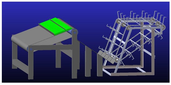 The sorting and conveying device has a lot of pieces, and its structure has been streamlined to save simulation time while still satisfying virtual test criteria. To conceal the wire mesh of the sorting mechanism, the rows of canes on the cane collecting plate are arranged horizontally, and 40 canes are pre-installed on the lifting conveyor belt. This simplifies the lifting conveyor belt by using a conveyor model with baffles. Steel material with a density of 7850 kg/cm3, a Young’s modulus of 20,700 MPa, and a Poisson’s ratio of 0.3 is used for the frame, sprocket, cane collection plate, and sorting mechanism [24]. Figure 6 displays the simplified simulation model.