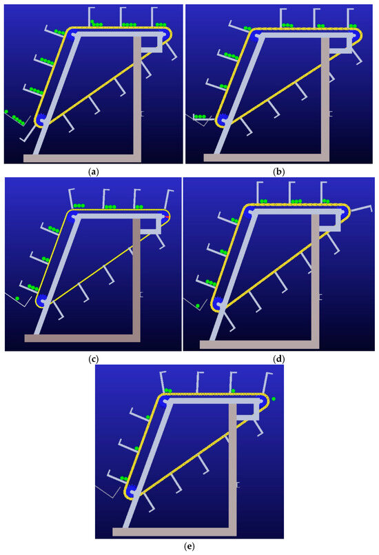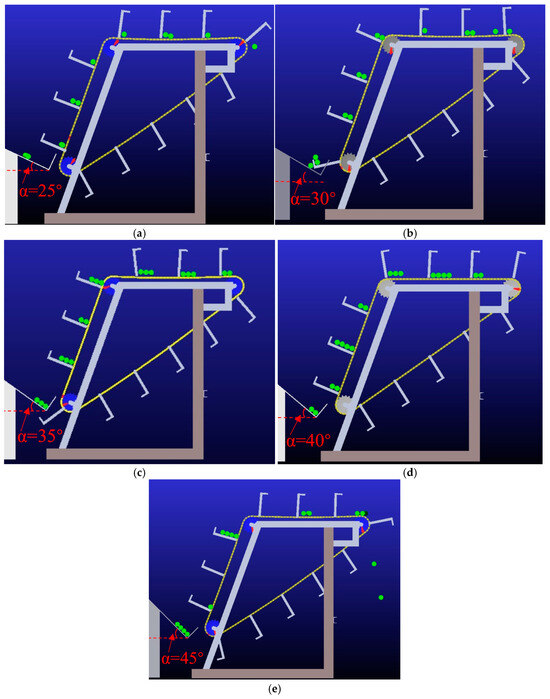 Process of simulating various cane collection plate inclination angles. (a) Represents the sorting of sugarcane at = 25°; (b) represents the sorting of sugarcane at = 30°; (c) represents the sorting of sugarcane at = 35°; (d) represents the sorting of sugarcane at = 40°; and (e) represents the sorting of sugarcane at = 45°.