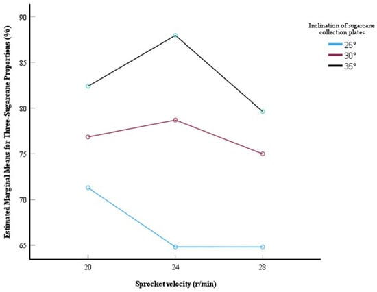 The experimental results were analyzed using two-factor repeated measures ANOVA through SPSS 29.0.2.0(20), and the results are shown in Table 5. The effect of both cane collection board inclination angle and sprocket speed on the percentage of sorted three roots reached a significant level (p < 0.05), with cane collection board inclination angle having a greater influence than sprocket speed. In addition, the interaction between the inclination angle of the collecting board and the sprocket rotation speed during the test reached the level of p < 0.05, so the interaction between the inclination angle of the collecting board and the sprocket rotation speed on the test indexes reached a level of significance. Therefore, it is necessary to analyze the interaction effect of the inclination angle of the collecting board and the sprocket rotation speed, shown in Figure 9. When the inclination angle of the collecting board is 25°, the sprocket rotation speed is faster, and the ratio of sorting three canes is smaller; when the inclination angles of the cane collection plate are 30° and 35°, with an increase in sprocket rotational speed, the percentage of sorting three canes increases and then decreases. When the inclination angle of the cane collection plate is 30° and the sprocket rotational speed is 24 r/min, the percentage of sorting three canes is the highest and reaches 87.96%, i.e., the sorting effect of the sorting mechanism under this factor level is the best.