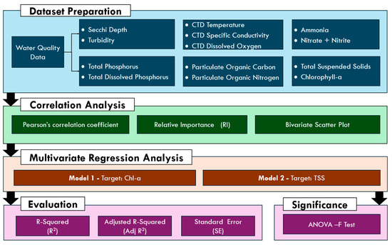 Figure 1 outlines the workflow for the proposed study, starting with dataset preparation, where water quality data undergoes preprocessing to address missing values, remove duplicate records, and ensure data consistency. In the Correlation Analysis phase, the relationships between the water quality variables and the target variables (Chl-a and TSS) are examined using Pearson’s correlation coefficient. Additionally, the relative importance (RI) index is employed to determine the influence of each predictor variable, while bivariate scatter plots visualize the linear relationships. This analysis identifies the key water quality parameters that exhibit statistically significant correlations with the target variables. The third stage involves Multivariate Regression Analysis, where two separate models are developed: Model 1, which focuses on predicting Chl-a concentrations, and Model 2, which targets the prediction of TSS levels. These models aim to uncover the functional relationships between the predictors and the target variables, considering the complexity and interdependence of the environmental factors. All statistical analyses and visualizations were performed using Python (v3.11.7) with the statsmodels, scikit-learn, and matplotlib packages.