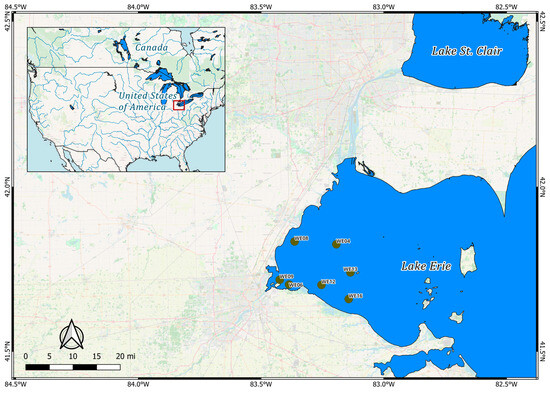 Location and description of western Lake Erie water quality monitoring stations operated by NOAA’s Great Lakes Environmental Research Laboratory. Retrieved from https://www.glerl.noaa.gov/res/HABs_and_Hypoxia/rtMonSQL.php (accessed on 16 October 2024).