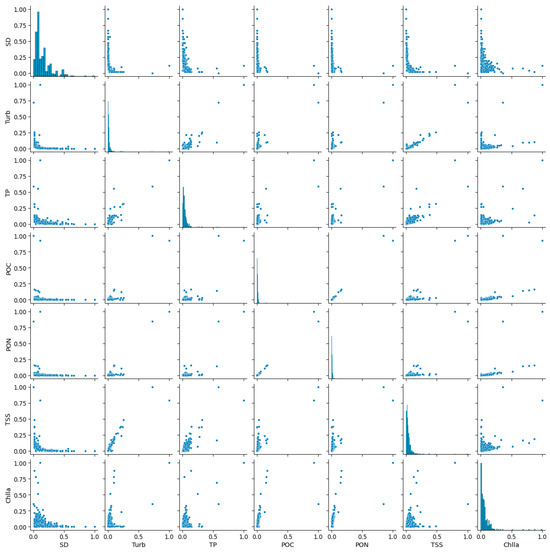Table 2 shows a summary of the descriptive statistics of the dataset after preprocessing. In the table, POC and PON levels varied widely as well, with maximums far exceeding the average, suggesting the presence of organic matter in different concentrations throughout the samples. On the other hand, TSS and Chl-a also showed large ranges in value, pointing to varied conditions in the sampled water bodies. The standard deviation for each variable suggests the extent of variation in the measurements, with some variables like turbidity and total phosphorus showing very high variability. It is noticed that we have in total 13 parameters, and we distinguish these parameters into two different targets: Chl-a and TSS (as one target) and the predictors (the rest of the parameters).