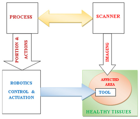 As mentioned before, patient safety is associated with the restriction quality of therapy to the distressed zone in the course of surgery. Such correctness hinges on the actuation precision of the surgical tool and its localization in the space. Consequently, the requirement for such high-quality spatial pursuing indicates an image-controlled position detection. Such clauses entail a joint configuration functioning autonomously, as illustrated by the schematics of a self-controlled surgical setting in Figure 1. Such organization consists of a scanner, tissue-touched zone, surgical tool, position and action processing, and robotic control and actuation [16,17]. The precision involved in such a closed-loop control procedure, related to position localization and actuation quality, would be shaped by various confounding features, including the degree of complexity of the combined constituents of the procedure, the associated uncertainties, and various unexpected peripheral risk occurrences. Only a reduction in such perturbing features permits a consistent control.