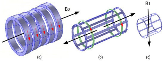 MRI field components: (a) electromagnet B0, (b) gradient coils (one couple for one axis), and (c) RF coil (birdcage) B1.
