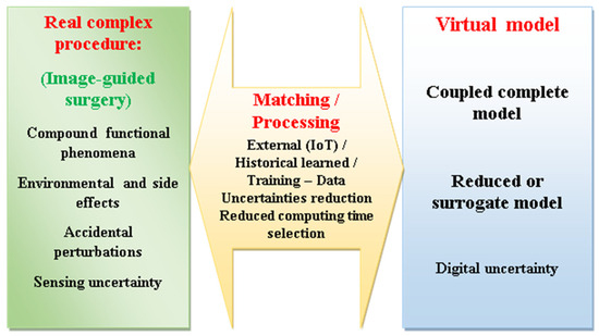 The detailed DT supervision organization of an image-assisted robotic control is fashioned in this section. In general, concerning the abovementioned communications between the DT sides, the processed data of the physical side deliver detected information compared and adjusted by external Internet of Things “IoT” data and the learnt historical one. The outcome, once trained as data analysis, is conveyed, with an appropriate model reduction indication, to the DT virtual side. Actually, a swift communication (matching) between the sides of DT necessitates a faithful virtual model but with undersized execution time. Thus, the comprehensive coupled model, which realistically represents the physical procedure, would be reduced, allowing moderate computation time but preserving the picture of the real procedure. The management of an image-guided robotic control employing a DT pair fulfills an operational adaptive control procedure involving the real procedure matched with a reduced virtual model [80]. Figure 3 schematically illustrates the features of a DT monitoring an image-assisted robotic surgery. Such procedure monitoring could be used for staff training, predictions using physical phantoms and their digital replicas, or a real patient–virtual replica model, involving self-ruling matching with staff in the loop.