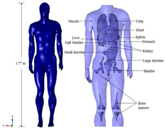Virtual numerical models (digital phantoms) can personify the living tissue body part involved in the surgical procedure. Important features of these models should correspond to the nature of material and organic properties, geometric form, and consistency with the computational approach used. Diverse body copies with living tissue features exist in the literature [94,95,96,97,98,99]. Figure 4 displays a structural body with its different body parts and tissues [100].