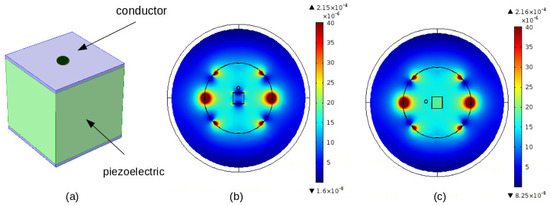 MRI RF B1 (vertically directed) field distribution in the case of insertion of a piezoelectric covered by two electrodes, (a) material framework (b) distribution of B1 field—electrodes perpendicular to the field, and (c) distribution of B1 field—electrodes parallel to the field [17].