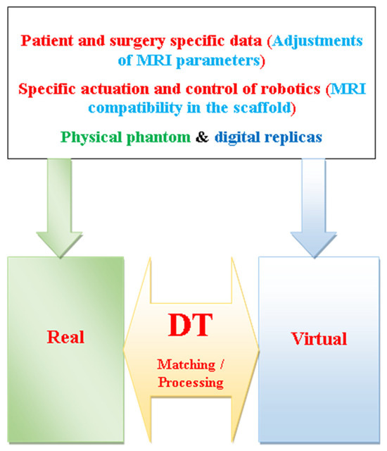Following the DT supervision of MRI-assisted surgery discussed in Section 4.3, such supervision requires planning to adjust and verify the various medical pre-arrangements. This would be accomplished by using physical phantoms and their digital replicas in the DT tool. These pre-arrangements include patient and surgery specific data, corresponding adjustments of MRI scanner parameters, the MRI compatibility of objects inserted into the scaffold, and the related actuation and control of robotics specific to the surgery involved. Such pre-arrangements are illustrated in Figure 7.