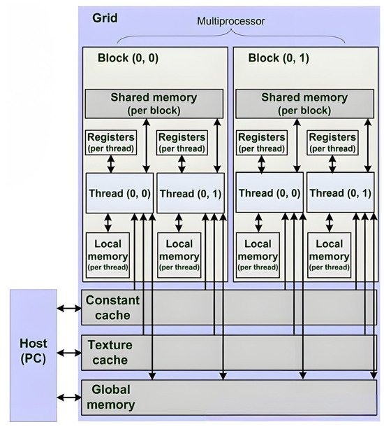 CUDA programming mainly involves two main parts: the host code and device code. The host code runs on the CPU and is responsible for data preparation, task scheduling, and results collection. The device code runs on the GPU and is responsible for executing the actual computing tasks. Developers need to use the CUDA compiler to compile the device code into GPU-executable binary files, and then call these functions in the host code to perform the computing tasks. The CPU and GPU each have independent memory address spaces, including host-side memory and device-side video memory. CUDA’s memory operations are the same as those of general C++ programs. The GPU has a unique graphics memory system, and the operating graphics memory requires calling the memory management functions in CUDA’s API, including opening, releasing, and initializing the graphics memory space, as well as transferring data between the host and device sides. The CUDA parallel computing function running on the GPU is called a kernel. A kernel is not a complete program, but a step in the CUDA program that can be executed in parallel. A complete CUDA program is composed of a series of device-side kernel functions and host-side serial steps, which are executed in the order of the corresponding statements in the program. Figure 2 is a hardware storage architecture diagram of a GPU.