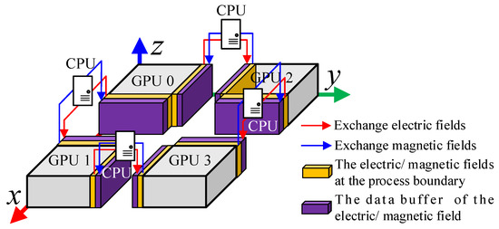 - The CPU exchanges the data between adjacent processes through MPI (Message Passing Interface) technology: After the data are copied to the CPU memory, the CPU uses MPI technology to exchange the data between adjacent processes. An MPI is a commonly used communication protocol in parallel computing, which can transmit information between multiple processors and ensure that the necessary electromagnetic field data can be shared between different GPUs.