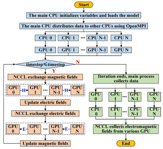 The flow chart of the FDTD algorithm based on clustered GPUs is shown in Figure 6.
