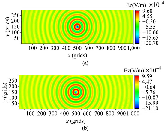 The computational space is discretized into , and the total number of grids is 90 million. The excitation source is an electric dipole in the z-direction located in the center of the calculation region. It is a time–harmonic field with a frequency of 300 MHz. In this example, the FDTD algorithm based on a CPU and GPU is used to calculate the snapshot of the z-component of the electric field (Ez) for the xoy cross-section at the 3000th time step, as shown in Figure 7. The results of the CPU and GPU at a monitoring point are compared in Figure 8, which proves that the FDTD calculation results based on a GPU are accurate.