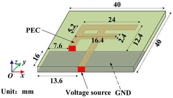 The radiation direction of an inverted-F antenna is simulated to illustrate the accuracy and efficiency of the scheme. The inverted-F antenna is etched onto a 40 mm × 40 mm substrate with a relative permittivity of 2.2 and a thickness of 0.787 mm. The antenna design size is shown in Figure 9. At the antenna port, a voltage source is used for excitation. The internal resistance of the voltage source is and the voltage is 1 V. The far-field radiation pattern of the antenna at a 2.4 GHz operating frequency is calculated using HFSS 2022 R1 and GPU-based FDTD parallel algorithms. The grid discrete size of the FDTD algorithm is , , , and the calculation results are shown in Figure 10. It can be seen that the calculation results of the FDTD parallel algorithm based on a GPU and HFSS are in good agreement, which proves the calculation accuracy of the proposed parallel algorithm. Table 2 shows the calculation time, speedup, and parallel efficiency under the conditions of a CPU, a single GPU, dual GPUs at a dual node, and four GPUs at a dual node to verify the validity of the GPU-based FDTD method. In this example, a single GPU can obtain about 16 times the speedup compared with the CPU. Also, with the increase in the GPU number, the computational efficiency gradually decreases, which is caused by the increased communication time. The NCCL technology presented in this article can significantly reduce the communication time and improve the computational efficiency.