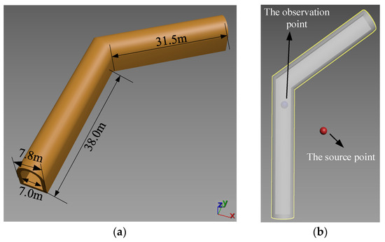 Radio wave propagation in a tunnel. (a) The three-dimensional structure of the tunnel. (b) A schematic diagram of the source and observation point positions.