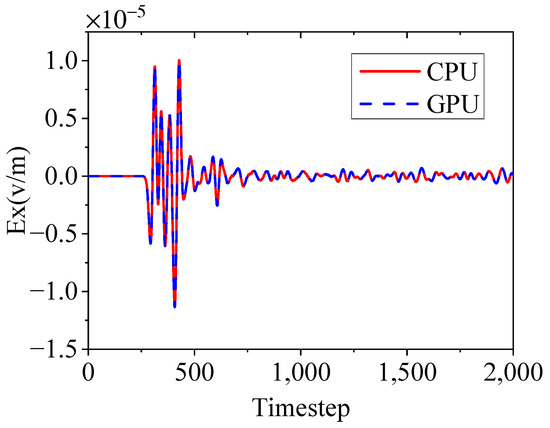 In this example, radio wave propagation in a tunnel is simulated. The structure and dimensions of the tunnel are shown in Figure 11a, and the permittivity and conductivity for the tunnel are and , respectively. A schematic diagram of the source and observation point positions is shown in Figure 11b. The excitation source is a Gaussian pulse. An FDTD algorithm based on a CPU and GPU is used to calculate the x-component electric field (Ex) of the observation point, as shown in Figure 12, which exhibits good consistency. Similar to the two other examples, the calculation time, speedup, and parallel efficiency under the conditions of a CPU, a single GPU, dual GPUs at a dual node, and four GPUs at a dual node are tabulated in Table 3, which proves the efficiency of the proposed method.