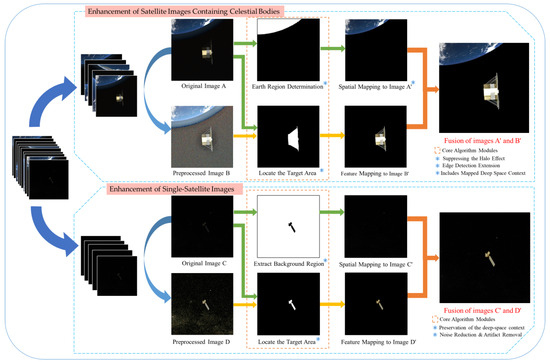 In this section, we present a low-light enhancement method for deep-space backgrounds based on multi-image fusion. Given the unique characteristics of deep-space background images and the variations in target composition, this study classifies deep-space background images into the following two categories: (1) isolated satellite images, which refer to images that contain only a single spacecraft body and have no interference from other celestial bodies; and (2) satellite images containing celestial bodies, which refer to satellite images that contain natural celestial bodies (e.g., Planet Earth). This categorization takes into account the differences in noise characteristics and target properties in various scenes, providing a theoretical foundation for designing the enhancement method. Figure 1 illustrates the architecture and processing flow of this enhancement method for deep-space background satellite images.