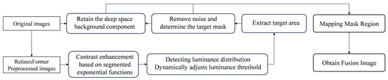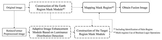 The processing flow for this type of image is illustrated in Figure 4. Initially, the halo in the original image is extracted and removed based on brightness information, creating a mask for the Earth area to prevent enhancement of that region. After preprocessing the image using RetinexFormer, noise and artifacts introduced during the preprocessing stage are reduced and eliminated through an adaptive image enhancement module that detects brightness distribution. Subsequently, the enhanced satellite target area is extracted, and a mask for this target area is created. Finally, these masks are used to map and generate a fused image.