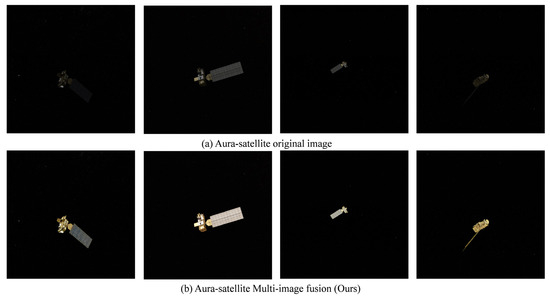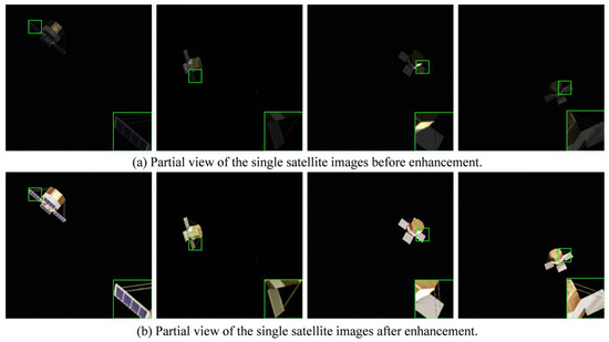 where M denotes the final target region mask. This method effectively preserves the detailed information of the deep-space background while enhancing the target. Figure 3 demonstrates the comparison of several single satellite images before and after enhancement.