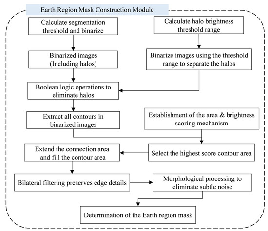 The Earth region mask construction module is illustrated in Figure 5. This module serves to extract the Earth region while effectively suppressing and eliminating the halo effect. It primarily involves several key steps: calculating the segmentation threshold and conducting binarization, determining the halo range, extracting and separating the halo, performing contour analysis and optimizing the region, as well as executing post-processing to generate the final mask.