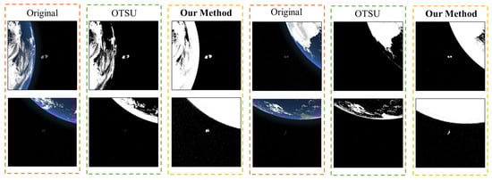 The comparison effect of the proposed method in this paper with the OTSU [22] algorithm for the binarization of images is shown in Figure 6. The proposed method can display the Earth and satellite target regions more completely, for the extraction of the Earth and satellite target regions, to avoid the loss of some regions.