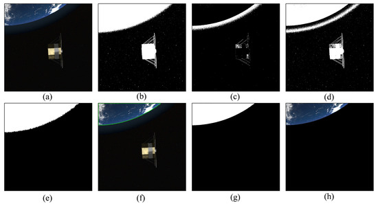 where represents the circular structural element and denotes the binary image of the filling expansion after selecting the contour . Figure 7 illustrates an example of the process of extracting the Earth region.