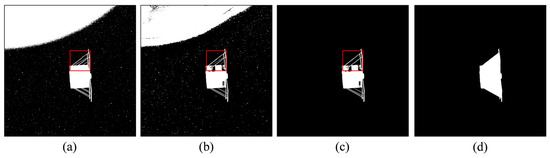 Several binary images utilized in the process of determining the target area mask. (a) Binary image of the original image; (b) binary image of the preprocessed image; (c) binary image of the extracted target; (d) the final target mask.