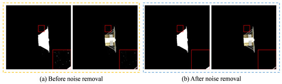 The grayscale image of image undergoes threshold segmentation using the Otsu algorithm [22], followed by edge detection with the Canny operator [23]. Subsequently, the edge detection extension algorithm is applied to detect the original target boundary and expand it outward while maintaining its shape. In cases where the extended edge intersects with other edges, the intersection is retained; if there is no intersection, the original boundary remains intact. This method effectively prevents the loss of the target area. Following this, the results from edge detection and threshold segmentation are combined, allowing for further expansion and refinement of the target area. Any regions identified as mergeable are combined to minimize the risk of target area loss. Finally, the dynamic noise threshold is calculated for denoising, resulting in the final target area mask. Figure 10 presents the comparison of the target area masks and mapped images before and after denoising.