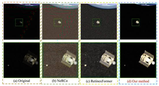 The original image serves as a reference for comparing images enhanced through various methods. Figure 15 provides a localized visual comparison with two state-of-the-art deep learning methods. A comparative analysis of the local views of satellite targets enhanced by different methods reveals that while the deep learning-based approaches, NeRCo and RetinexFormer, enhance satellite targets to some extent, they also introduce excessive noise during the enhancement process, ultimately degrading visual quality. In contrast, the proposed method not only effectively preserves and enhances fine details but also demonstrates superior capability in suppressing noise and artifacts, achieving significantly better visual results than the other two methods.