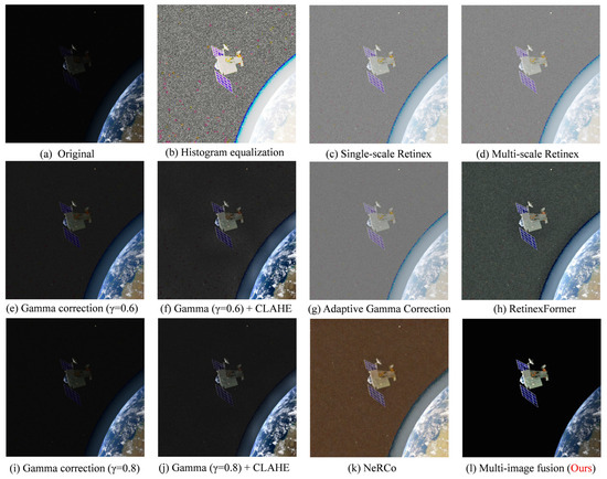 The experimental results of the proposed method are compared with those of other methods as follows. Table 3 provides the quantitative evaluation data for various low-light image enhancement methods applied to satellite images containing the Earth region, while Table 4 presents the results for single satellite images. In both tables, values highlighted in red indicate the best performance, whereas values in blue denote the second-best performance.