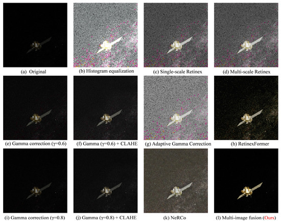 In the quantitative evaluation, this study processed 10 types of representative artificial satellites, encompassing 3940 satellite images containing the Earth and 51,671 individual satellite images. When assessing images that include the Earth, the proposed method achieved PSNR exceeding 35.61 dB, which is more than 2.92 dB higher than the second-best method (gamma correction with γ = 0.8) and 6.18 dB higher than the deep learning–based RetinexFormer method. Additionally, the SSIM reached 0.782, greatly surpassing the scores of both NeRCo and RetinexFormer. For individual satellite images, the proposed method achieved a PSNR of over 50.79 dB and SSIM above 0.95, indicating that the enhancement method proposed in this paper can improve details while avoiding excessive image distortion and information loss, and effectively suppresses noise and artifacts.