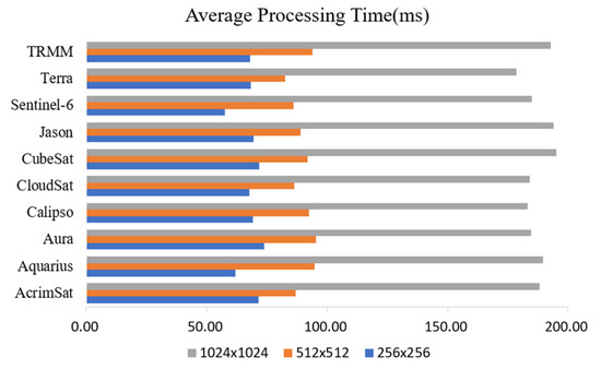 To more intuitively show how the performance changes with image resolution, we plotted a bar chart of the average processing time of different satellite images at three resolutions, as shown in Figure 21.