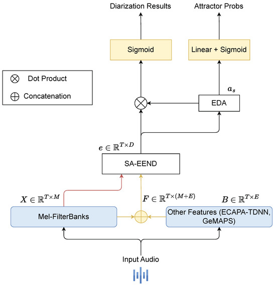 The EEND-EDA (End-to-End Neural Diarization with Encoder-Decoder based Attractors) architecture introduces a flexible framework for speaker diarization that supports two distinct processing paths, as illustrated in Figure 1. The system can operate either with traditional acoustic features alone or with an enhanced representation that combines multiple feature types [33]. The architecture comprises three fundamental components: