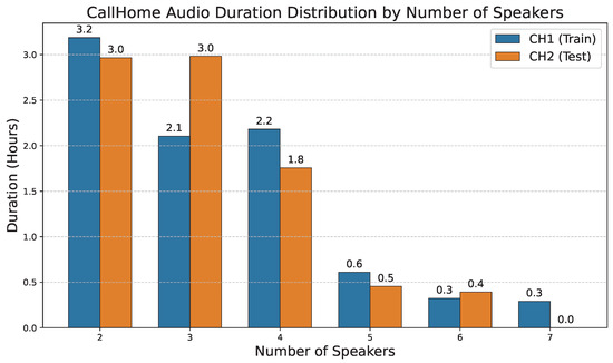 The evaluation employs the CallHome (https://catalog.ldc.upenn.edu/LDC2001S97) dataset, with one subset (CH1) used for adaptation and the other (CH2) for testing, both defined in the Kaldi [35] recipe for CallHome (https://github.com/kaldi-asr/kaldi/blob/master/egs/callhome_diarization/v2/run.sh). As shown in Table 1, the CallHome database presents a notable class imbalance, with two-speaker conversations comprising approximately 62% of the training set (CH1) and 59% of the testing set (CH2). Figure 2 illustrates the distribution of audio duration in hours across different number of speaker for both datasets, providing further insight into this imbalance.