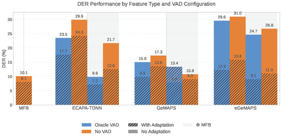 Feature concatenation with MFB yields substantial improvements across all configurations. Without adaptation, ECAPA-TDNN ⊕ MFB yields a DER of 9.9%, while GeMAPS ⊕ MFB achieves 13.4% and eGeMAPS ⊕ MFB shows 24.7%. With adaptation, the ECAPA-TDNN ⊕ MFB combination achieves the best performance with a DER of 7.2% under Oracle VAD conditions, representing a 10.8% relative improvement over the baseline. Similarly, adapted GeMAPS ⊕ MFB achieves a DER of 9.9%, while adapted eGeMAPS ⊕ MFB reduces the error to 9.1%.