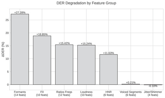 Figure 4 shows the DER degradation (DER%) when different feature groups are perturbed during inference. In this context, “perturbed during inference” refers to averaging each parameter in the corresponding feature group across all frames in the utterance, effectively neutralizing their discriminative information while maintaining the overall structure. The formant-related features (14 parameters) show the highest impact, with a 27.28% DER increase when masked, followed by fundamental frequency features (F0, 10 parameters) with an 18.85% degradation. Frequency ratios and loudness parameters also demonstrate substantial importance, causing 15.42% and 15.24% DER increases respectively. In contrast, jitter/shimmer and voiced segment features show minimal impact (0.2% DER change), suggesting their limited contribution to speaker discrimination in our diarization framework. For more details about the fundamentals of the GeMAPS features, see [30].