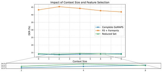 The paralinguistic parameter sets, GeMAPS and eGeMAPS, are extracted using a 60 ms analysis window with 10 ms shift. We did not select a smaller window size due to inherent limitations in the minimum window size required for these feature sets, with 60 ms being the minimum possible. The base GeMAPS set produces 62 features encompassing frequency, energy, spectral, and voice quality parameters, while eGeMAPS extends this to 88 features with additional voice quality and spectral characteristics. When combining features through concatenation, temporal alignment is maintained through consistent 100 ms frame intervals. The resulting feature vector dimension depends on the context size, following the formula: . For example, with our proposed reduced set of 52 GeMAPS features presented in Section 4.1.1 and a context size of 2, the resulting vector has 260 dimensions (52 × (2 × 2 + 1)). When concatenated with 345-dimensional MFB features, this produces a final feature vector of 605 dimensions. In the results section, we present an analysis for two-speaker scenarios examining how different stacking contexts affect these feature types. Additionally, we explore the use of Oracle VAD during both training and inference for two-speaker cases. However, as our results demonstrate, GeMAPS already contain sufficient information about non-speech segments, making Oracle VAD unnecessary for the multi-speaker experiments.