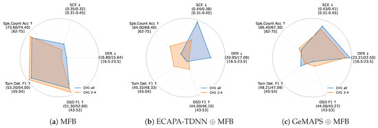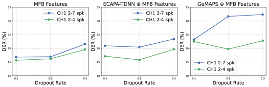 Figure 3 presents the diarization performance for different feature configurations in two-speaker conversations on the CH2 CallHome (CH2-2spk). The evaluation encompasses our proposed feature types (ECAPA-TDNN, GeMAPS, and eGeMAPS) compared against the baseline MFB features, both as standalone inputs and in concatenated configurations.