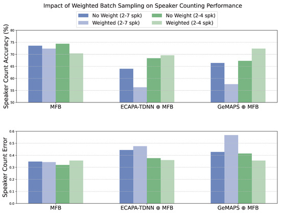 Table 2 provides a detailed breakdown of the DER components for the best feature configurations. These optimal configurations will be utilized in subsequent multi-speaker experiments. The adapted ECAPA-TDNN ⊕ MFB system achieves the lowest overall DER (7.20%), with balanced errors across miss detection (3.0%), false alarm (3.05%), and speaker error (1.15%) components. Notably, the adapted GeMAPS ⊕ MFB system demonstrates the lowest false alarm rate (2.40%) and speaker error (0.90%), suggesting that these features excel at precisely identifying speech boundaries and distinguishing between speakers, particularly where background noise is present, despite having a higher miss rate (5.74%) than other configurations.
