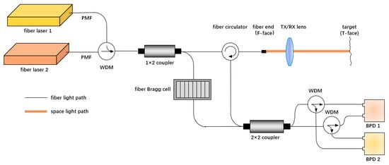 Figure 1. Two lasers with closely matched wavelengths are coupled into the same optical fiber via a wavelength division multiplexing (WDM) device. The laser is split into reference and transmitted beams using a beam splitter. The transmitted light is focused onto the rough target using an optical fiber point diffraction method through a transmit–receive telescope. The reflected light then returns through the telescope and optical fiber circulator, forming the measurement beam, which interferes with the reference light that has been frequency-shifted by a fiber Bragg grating. The heterodyne interference is generated at the coupler, and the interference signals of different wavelengths are separated by two WDM devices.