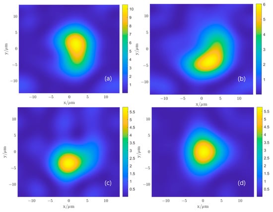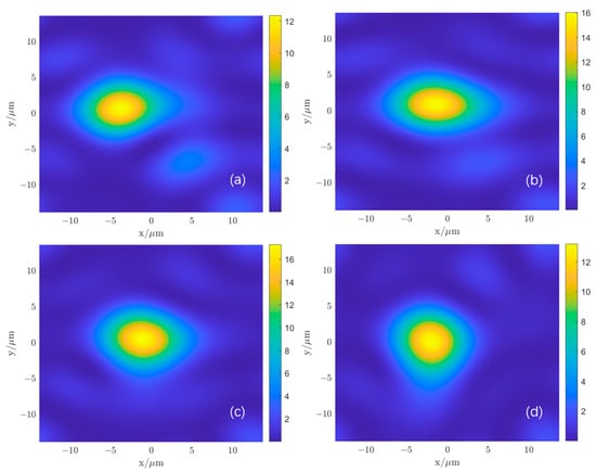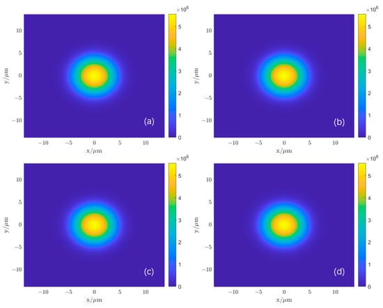 In the equation,  and  are real parameters,  is the first-order Bessel function of the first kind,  is the zeroth-order modified Bessel function of the second kind,  is the first-order modified Bessel function of the second kind,  is the refractive index of the fiber core,  is the refractive index of the fiber cladding,  is the wave number in vacuum,  is the wavelength in vacuum, and , which is the longitudinal propagation constant of the LP01 mode, can be determined by solving the LP01 eigenvalue function. By substituting into Equation (4), the numerical result for  is obtained. Finally, the two-dimensional distribution of the stable light field inside the single-mode fiber at a wavelength of  can be computed.