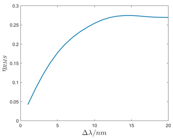 The RMS value of coupling efficiency variation quantifies the speckle pattern differences for the same rough target at different wavelengths. A higher RMS value indicates greater speckle pattern disparity. This characteristic enables the selection of two wavelengths with appropriate differentiation to ensure complementary interference signal strengths—when one channel’s interference signal is weak, the other channel can maintain high signal intensity. As shown in