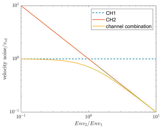Figure 8 compares the relationship between the combined velocity noise and the single-channel velocity noise as the amplitude envelope ratio between Channel 2 and Channel 1 varies.