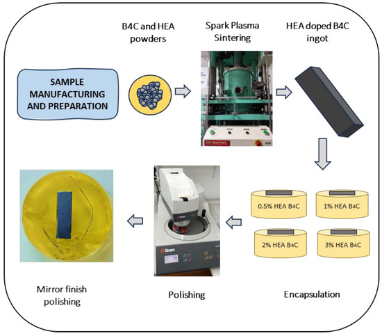 Then, the manufactured samples were embedded in a two-component epoxy resin. Using a Struers TegraPol-11 system (Struers, Copenhagen, Denmark), the surface was prepared via a two-step polishing procedure that included initial grinding with silicon carbide abrasive sheets (240–2000 grit) and final polishing with a 0.1 µm alpha alumina suspension to achieve a mirror-like sheen. The fabrication and preparation procedure of all studied samples is described in Figure 1.