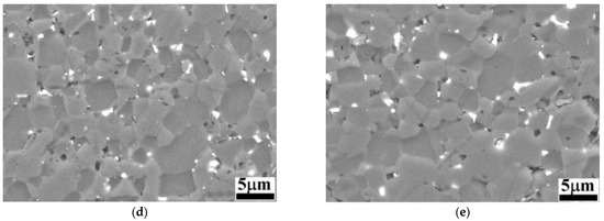 BSE-SEM images of B4C and B4C-doped composites: (a) monolithic B4C; (b) B4C.05; (c) B4C.1; (d) B4C.2; (e) B4C.3.