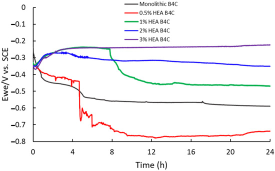 Figure 3 presents a clear tendency towards higher corrosion potential as the HEA volume percentage increases. The B4C.05 sample shows a remarkable drop close to 5 h of immersion, which indicates a surface activation during exposure to 3.5% NaCl solution; however, after 13 h of immersion its corrosion potential began to increase, inherent to the creation of a passive film on the outer layers of the composite, suggesting that it becomes thermodynamically stable under a marine environment. Sample B4C.1, at close to 8 h of immersion, shows another potential drop, followed by a slight tendency to a potential decrease. Sample B4C.3’s corrosion potential first decreased but rapidly increased, just like sample B4C.2’s corrosion potential; however, during exposure, B4C.3’s corrosion potential shows a clear positive tendency.