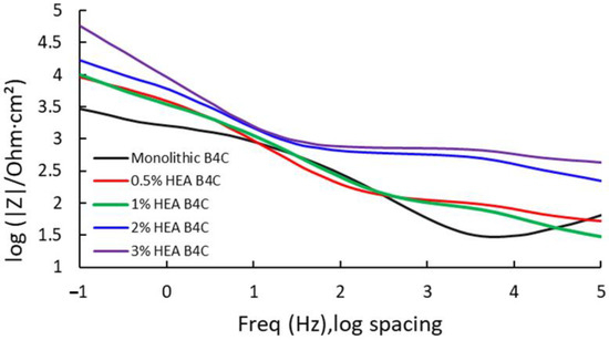 In Figure 5, it is observed that the highest measure of impedance is attributed to B4C.3, which registered a value of 60.047 kΩ. This indicates that the 3% HEA composite has higher corrosion resistance as result of its capacity to oppose electric current. This is followed by B4C.2, presenting a similar result as obtained for the corrosion potential, as when the HEA volume percentage increases in the sample composition, the higher its corrosion resistance behavior. B4C.05 and B4C.1 presented similar results, indicating a very similar behavior.