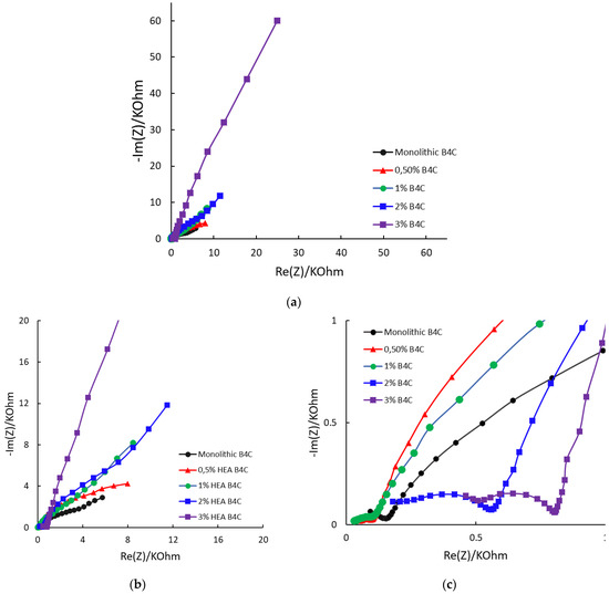 The Nyquist diagram reveals, for every sample, three remarkable zones, as seen in Figure 7. High and medium frequencies are described with semicircles, and low frequencies are defined by a straight line, which indicates Warburg element appearance. This indicates that the corrosion mechanism of the samples is changing, from charge transfer to diffusion, with the B4C.3 sample exhibiting the most pronounced Warburg impedance [45,46]. The overall trend indicates that increasing the HEA content enhances resistance behavior. This can be explained potentially due to agglomeration effects or altered charge transport mechanisms. This must be considered when optimizing these materials for electrochemical applications.