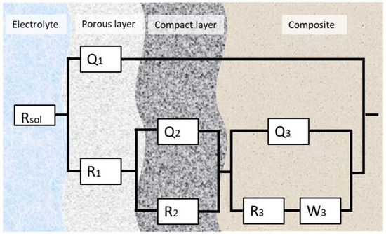 The experimental EIS data were analyzed using an electrical equivalent-circuit model, and ZSimpWin 3.6 software (Informer Technologies, Los Angeles, CA, USA) was used to accurately represent the impedance response. The equivalent-circuit model that provided the best fit for all studied samples can be seen in Figure 8. A chi-square (χ2) parameter close to 10−4 suggests a highly accurate fit between experimental and simulated data.