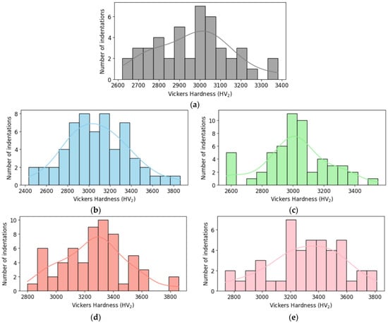 The histogram provides a visual representation of the frequency distribution of Vickers hardness values for each B4C sample under study. This allows for an easy and intuitive comparison of the hardness variations among different compositions. By analyzing the histograms, it is possible to identify the spread, central tendency and asymmetries of the hardness distributions among HEA additions (see Figure 9).